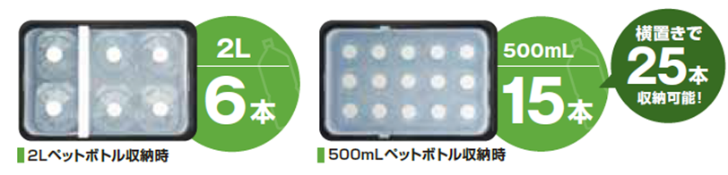 標準的な2Lペットボトルを立てた状態で6本収納できます。500mLペットボトルは立てた状態で15本、横置きで25本収納できます。