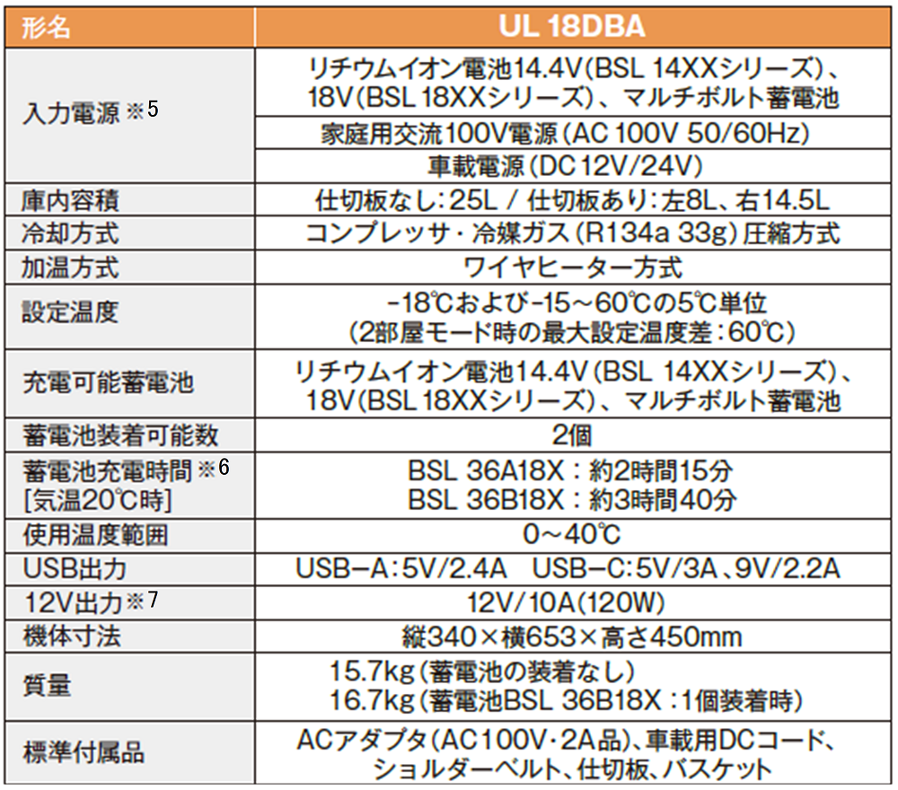 今回発売するUL 18DBAは、当社独自のリチウムイオン電池「マルチボルト蓄電池(36V⇔18V)」を搭載したコードレス冷温庫で、2021年に発売した大容量モデルのUL 18DB※2に、使いやすい機能を多数搭載した製品です。着脱可能な仕切板で庫内を2部屋に分割し、冷蔵と保温、冷蔵と冷凍など、用途に応じた異なる温度設定が可能です。2部屋の最大温度差は、60℃です。また、コンセントや車載用電源に接続した際の蓄電池(バッテリー)の充電時間が約1時間40分短縮され、さらに大容量のバッテリーBSL 36B18Xが標準付属するため長時間の使用が可能な他、スマートフォンの充電ができるUSB端子に新たにtype-Cが加わり、12V出力ソケットを搭載したことで、別売部品のケトルや市販の12V出力機器(ファン、電気毛布など)が使えるなど、使いやすさをさらに追求しています。