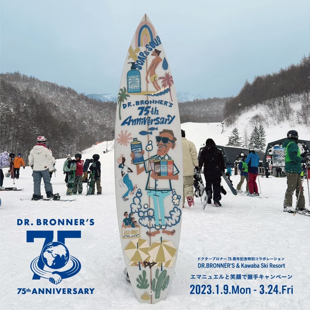 会場内に設置された、ドクターブロナー創業者エマニュエル・ブロナーのイラストが描かれたサーフボードと一緒に写真を撮ってインスタグラムに投稿していただくと、75日間で抽選で75名の方に、マジックソープと川場スキー場1日リフト券50%OFFチケット(2023-2024シーズンに利用可)をプレゼントいたします。