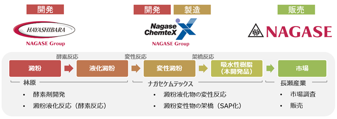 NAGASEグループは、澱粉構造を酵素変換することで吸水特性が大きく変化することに着目。林原の有する酵素技術と、ナガセケムテックスの樹脂製造技術を掛け合わせ、澱粉を主原料としながらも、SAPとしての吸水性能を最大限に引き出すことに成功しました。