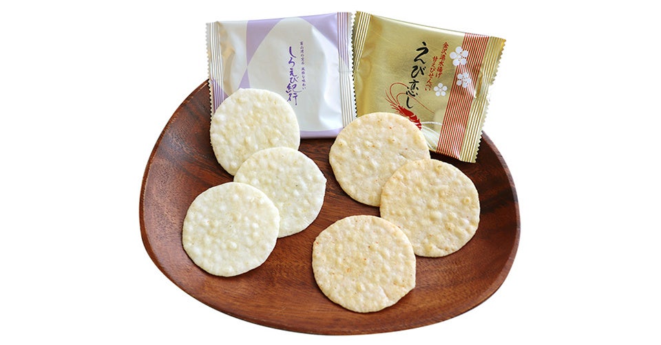 「しろえび紀行」は“富山湾の宝石”と呼ばれるしろえびを使用したパリッと食感の薄焼きえびせんべい。発売以来20年以上経った今でも多くのお客様に愛される商品です。