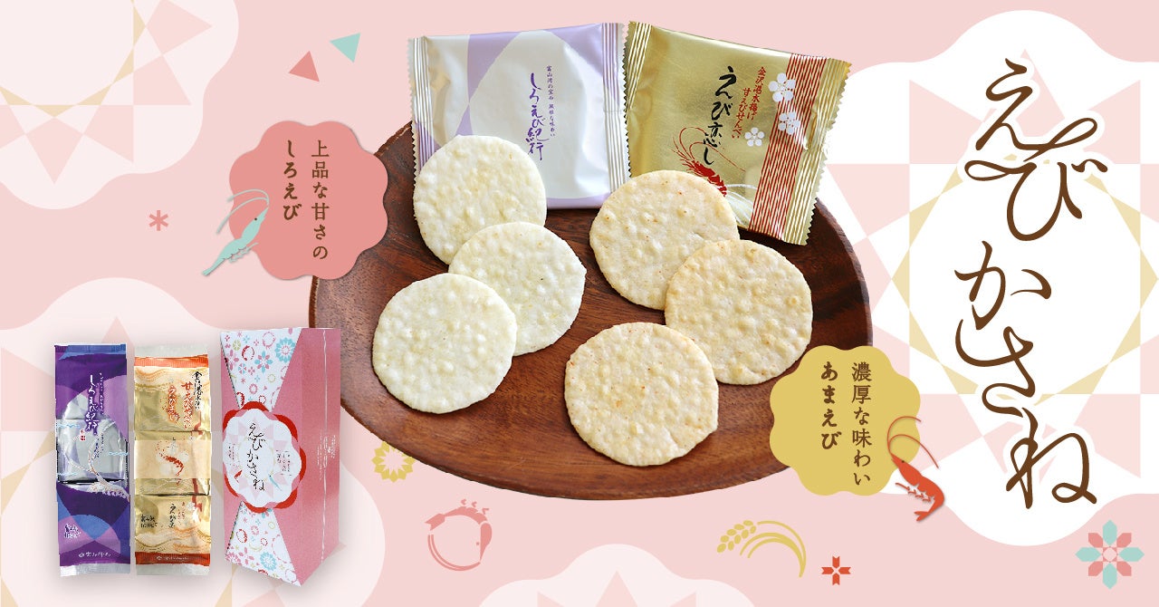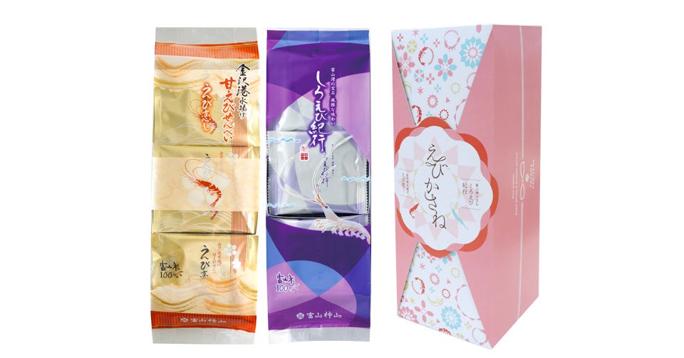 「えびかさね」は、富山柿山の看板商品「しろえび紀行」と金沢港水揚げの甘えびを使用した「えび恋し」の人気のえびせんべいがセットになった「紅白えびせんべい」のアソートボックスです。