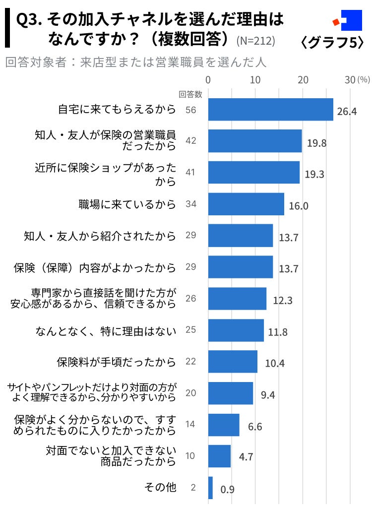 加入経路別のチャネル選択理由は、対面型チャネルの加入者は、営業職員であれば、「自宅に来てもらえる」、来店であれば「近所に保険ショップがあったから」と物理的な近さや身近さを理由とした方が最も多い結果となりました(グラフ5)。