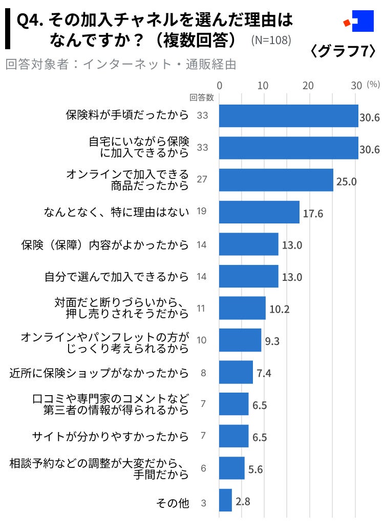 他方、インターネット・郵送で保険加入した理由の最多は「保険料の手頃さ」と「自宅にいながら加入できる」(共に30.6%)でした。さらに、インターネット経由での加入に限ると「オンラインで加入できる商品だったから」もほぼ同数が理由として選ばれました(グラフ7)。このことから、外出や営業職員を自宅に招く必要がなく、保険料に関する関心が強く、ご自身のニーズが明確な方がインターネット経由での加入を選択し、オンライン加入に至っているとも言えそうです。