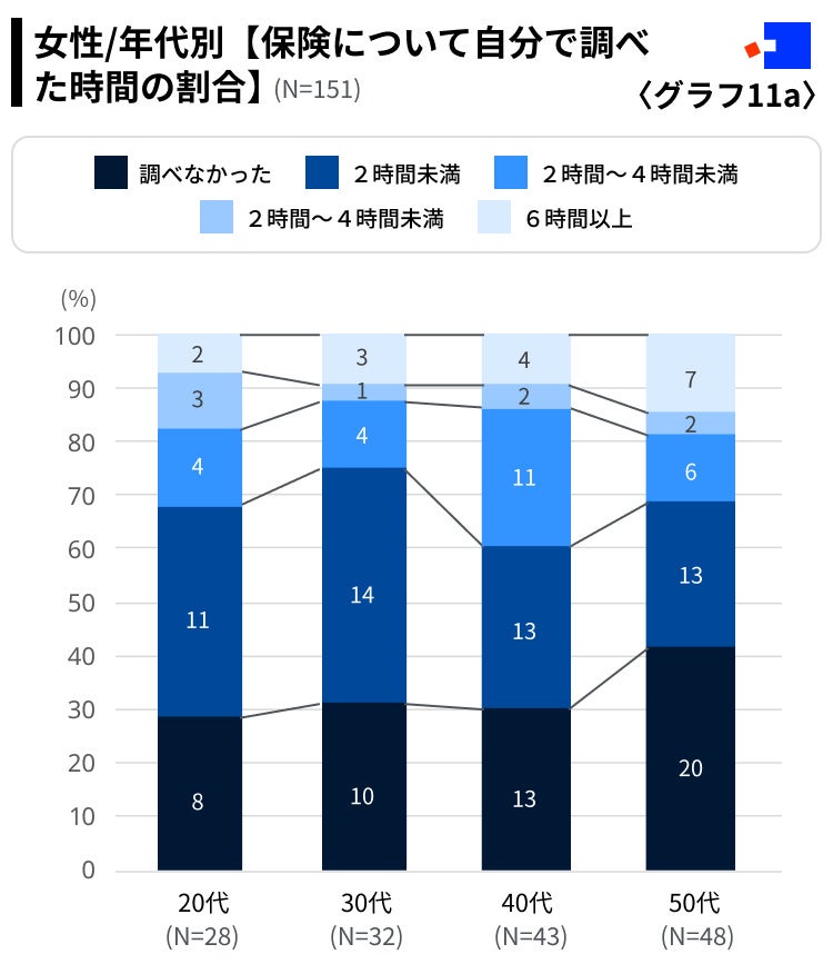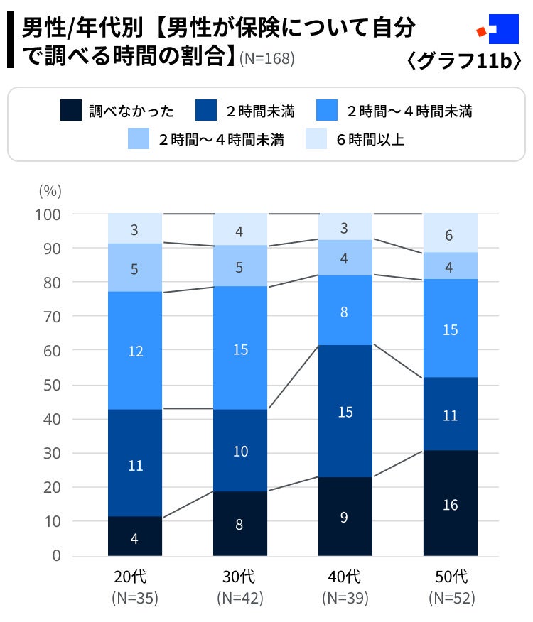 また、「保険加入までに保険について自分で調べた時間の割合」を男女別にみると、女性は「全く調べない」か「2時間未満」で済ませた人が同数(回答数51)となっており、女性の7割弱を占める一方、男性は、2時間~6時間調べる割合が6割弱を占め、女性よりも調べる人が多いことが読み取れます。(グラフ10)