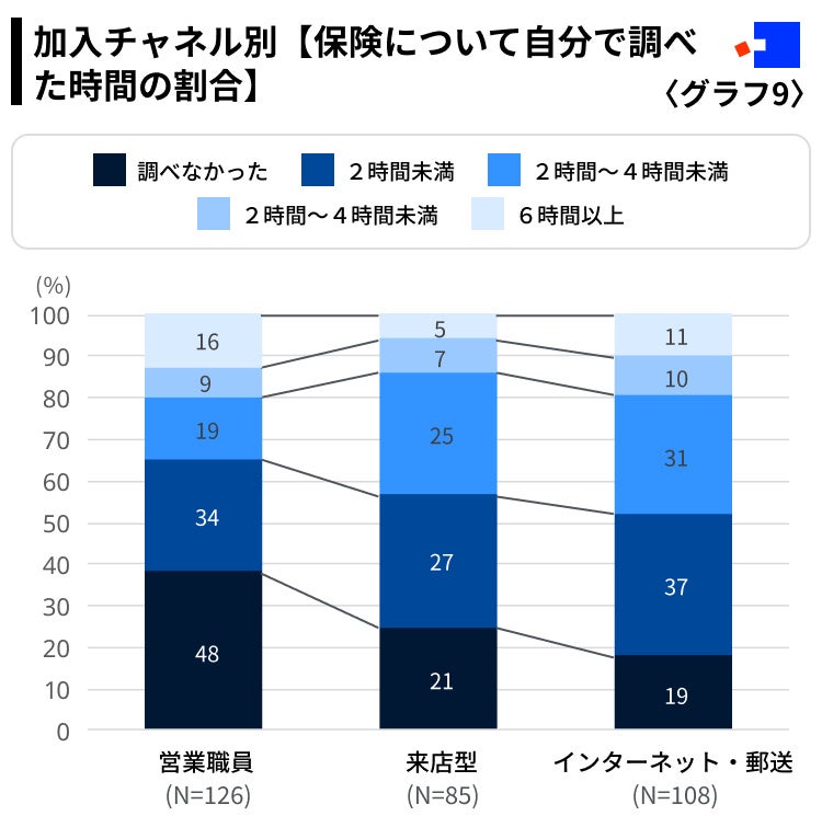 また、加入経路別の「保険加入までに、保険について自分で調べる時間」は、「営業職員→来店型→インターネット・郵送」の順番で、より多くの時間をかける傾向がみられます(グラフ9)。