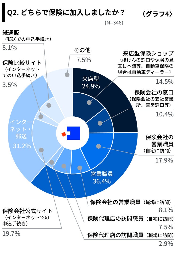 保険加入者の加入経路は、来店・営業職員を合わせた対面での加入が約6割、保険会社公式サイトでのダイレクト、保険比較サイト、郵送で手続きを行う紙通販を合わせたインターネット・郵送での加入が約3割でした(グラフ4)。