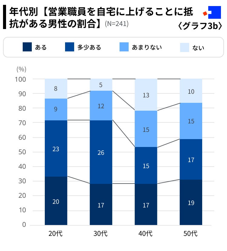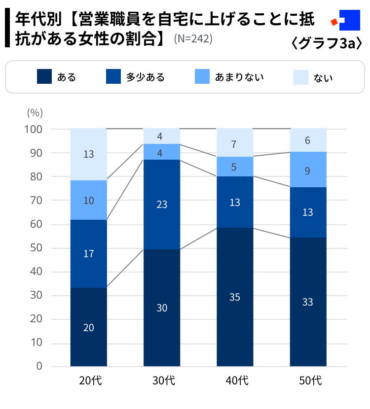 さらに、年代別にみると、30代の約8割が営業職員を自宅に上げることに抵抗がある、または、多少あると回答しており、特に30代女性においては、9割近くが営業職員を自宅に上げることに抵抗がある、または、多少あると回答しています(グラフ3a,b)。