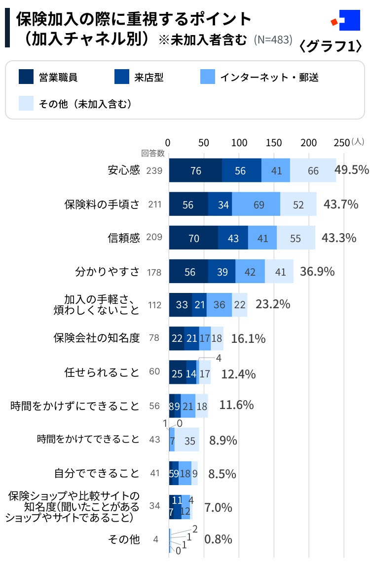 これに対し、インターネット・郵送経由での保険加入者のみで集計した場合は、「保険料の手頃さ」を選んだ人が一番多く(回答数69)、非対面で加入する場合には重視するポイントが異なる結果となりました(グラフ1)。