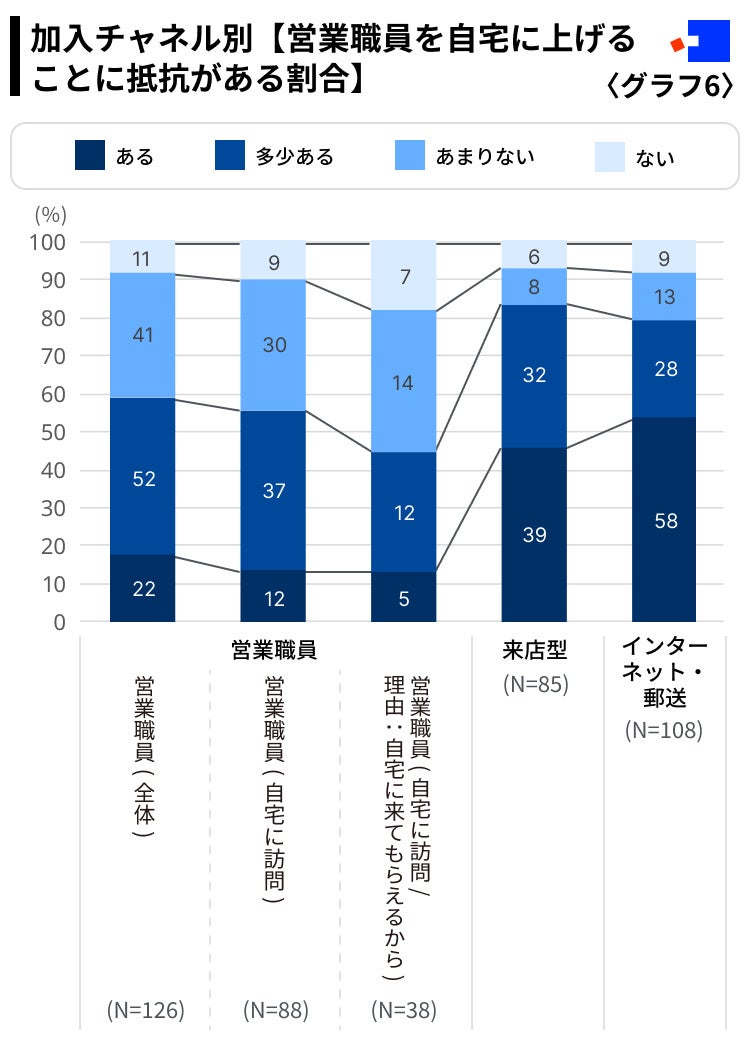 一方で、自宅に訪問した営業職員から加入している方でも半数以上は、営業職員を自宅に招くことに抵抗がある、または、多少あると回答しており、さらに、「自宅に来てもらえるから」を理由に上げている方についても4割強は営業職員を自宅に招くことに「全く抵抗がないわけではない」ことも分かりました(グラフ6)。このことから、自宅に営業職員を招くことに多少の抵抗はあるものの、それ以上のメリットを感じている方が一定数いることが読み取れます。