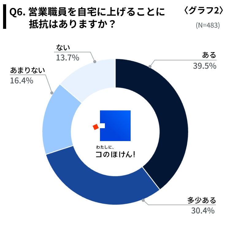営業職員が自宅に来てくれることで、慣れている自宅で保険相談ができる安心感や、時間を取って、出向かなくても自宅に来てくれるので助かるなどのメリットを感じる方がいる一方、営業職員を自宅に招くことに抵抗がある方もいるようです。調査の結果、全体の7割弱が自宅に上げることに抵抗がある、または、多少あると回答しています(グラフ2)。
