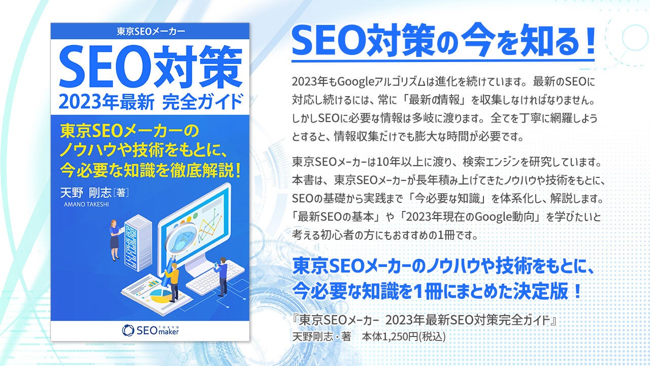 東京SEOメーカーが16年にわたるSEO研究(起業前5年、創業後11年)で培ったSEO技術とノウハウをもとにした決定版を、この機会に是非お手にとってみてはいかがでしょうか。