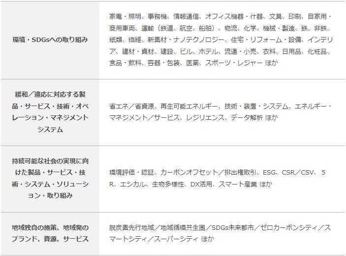製品・技術の有形の対象物以外の無形物の取り扱いについては、例えば、カーボンニュートラルの達成を視野にした事業活動、脱炭素・経済循環など地域のポテンシャルを活用した活性化の取り組み、サービス、ソリューション、IoT/AI/ビッグデータを活かしたビジネスモデル、金融サービス、個人及びグループであることを条件とします。