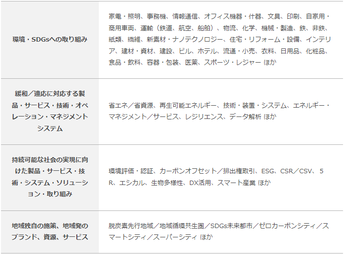 製品・技術の有形の対象物以外の無形物の取り扱いについては、例えば、カーボンニュートラルの達成を視野にした事業活動、脱炭素・経済循環など地域のポテンシャルを活用した活性化の取り組み、サービス、ソリューション、IoT/AI/ビッグデータを活かしたビジネスモデル、金融サービス、個人及びグループであることを条件とします。
