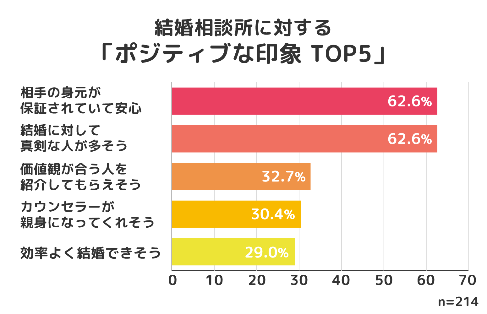 結婚相談所へのポジティブな印象を聞いたところ、最も回答が多かったのは、「相手の身元が保証されていて安心」と「結婚に対して真剣な人が多そう」が同率62.6%でした。