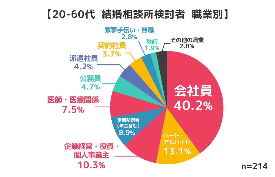 意外かもしれませんが、経営者や医療関係など、世間一般的に見てハイクラスと言われる方々も結婚相談所を検討していることが多いようです。いわゆるモテそうな印象がある職業であっても、出会いの場が限られていてなかなか出会いが無かったり、仕事があまりに忙しくお相手探しが難しい、といった状況から結婚相談所の利用を検討されていると考えられます。