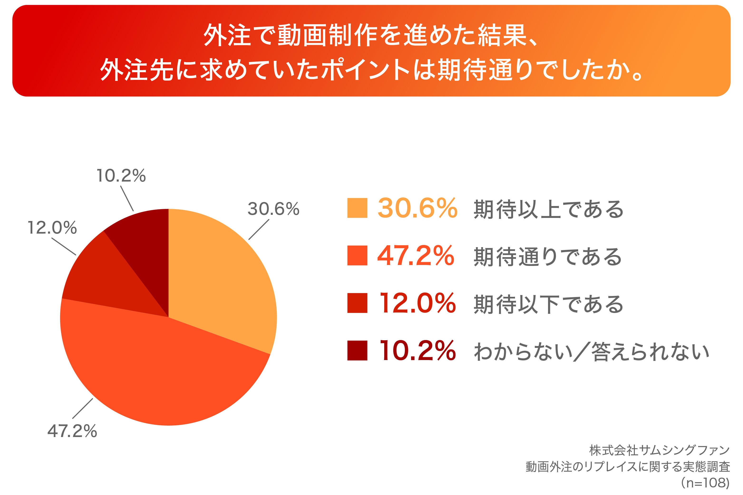 「Q4.外注で動画制作を進めた結果、外注先に求めていたポイントは期待通りでしたか。」(n=108)と質問したところ、「期待以上である」が30.6%、「期待通りである」が47.2%という回答となりました。
