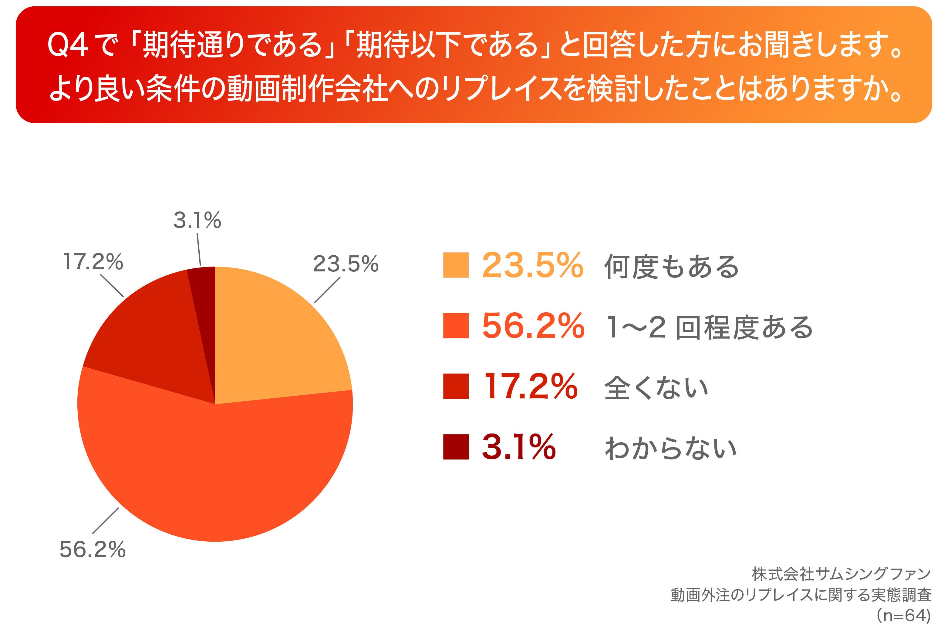Q4で「期待通りである」「期待以下である」と回答した方に、「Q7.より良い条件の動画制作会社へのリプレイスを検討したことはありますか。」(n=64)と質問したところ、「何度もある」が23.5%、「1~2回程度ある」が56.2%という回答となりました。