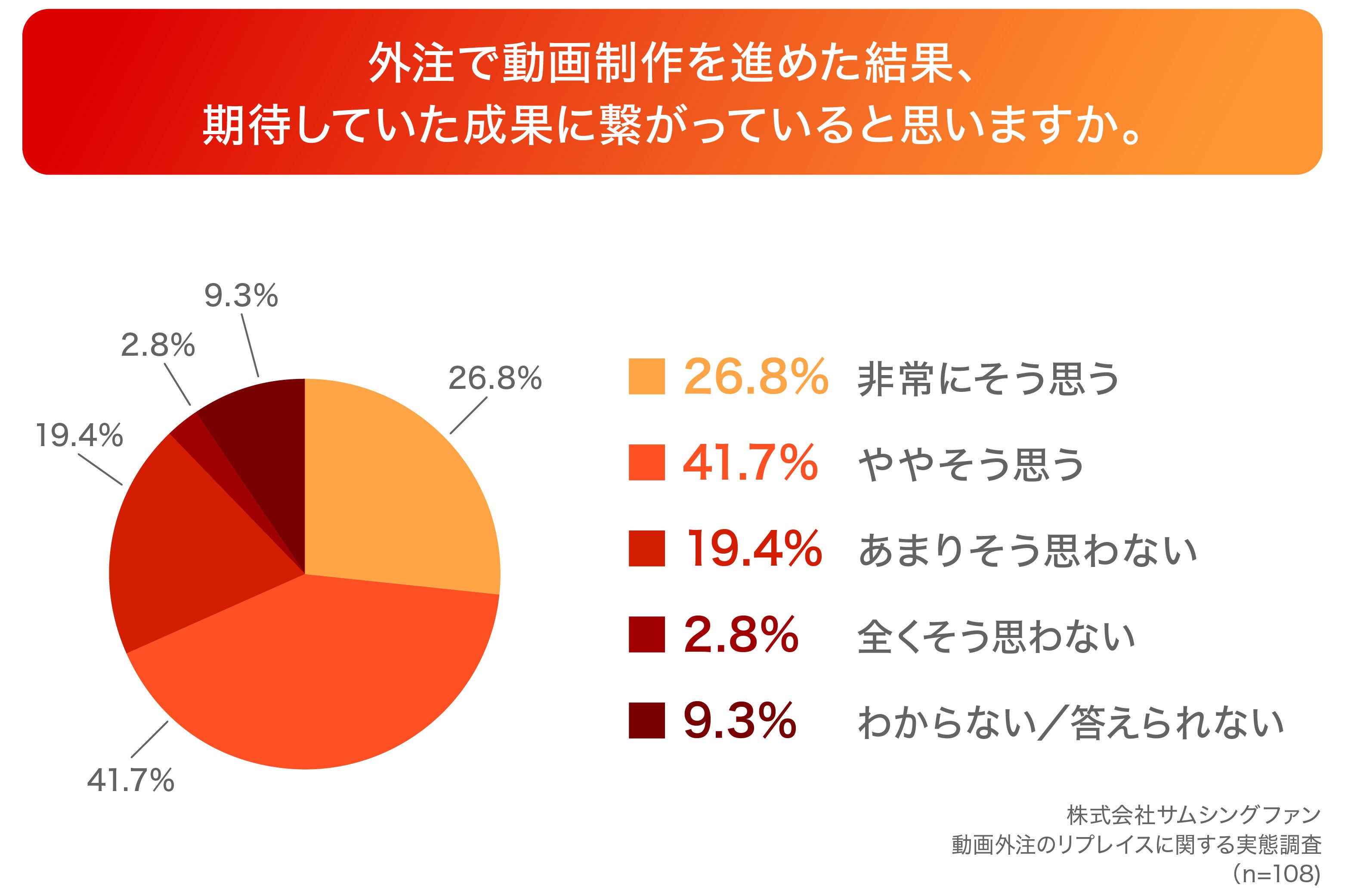 「Q5.外注で動画制作を進めた結果、期待していた成果に繋がっていると思いますか。」(n=108)と質問したところ、「非常にそう思う」が26.8%、「ややそう思う」が41.7%という回答となりました。