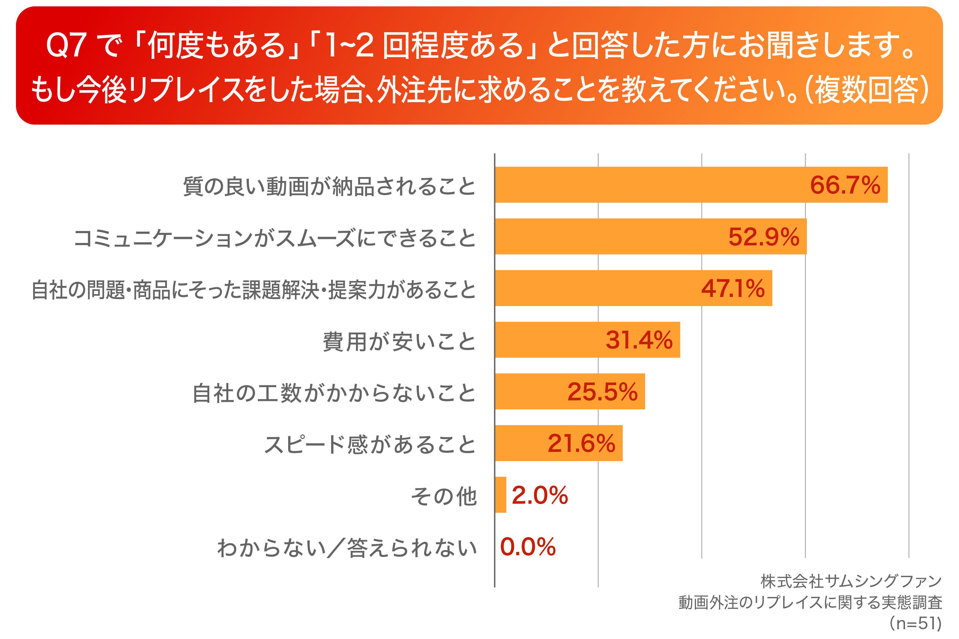 Q7で「何度もある」「1~2回程度ある」と回答した方に、「Q8.もし今後リプレイスをした場合、外注先に求めることを教えてください。(複数回答)」(n=51)と質問したところ、「質の良い動画が納品されること」が66.7%、「コミュニケーションがスムーズにできること」が52.9%、「自社の問題・商品にそった課題解決・提案力があること」が47.1%という回答となりました。