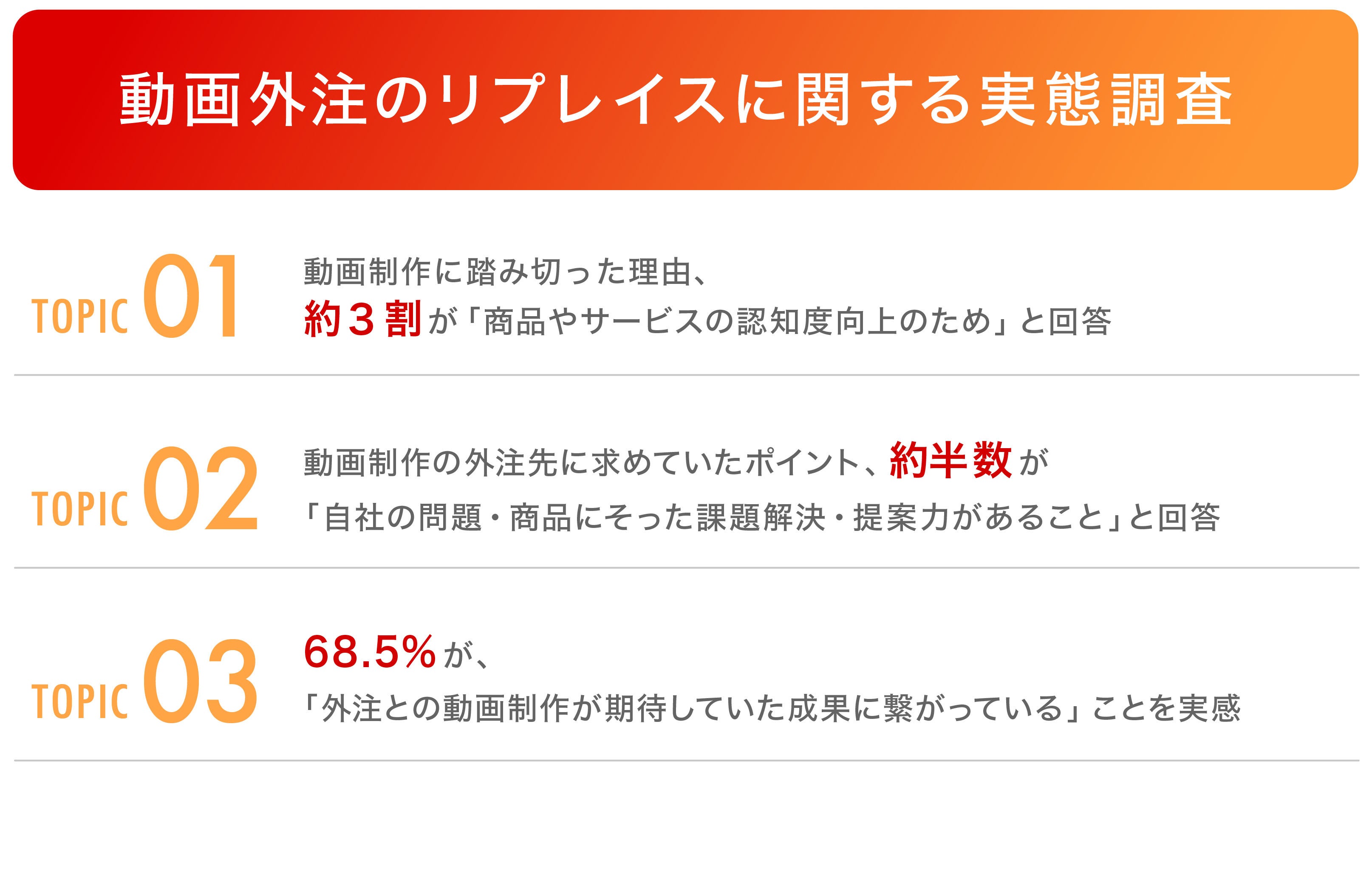 今回は、動画制作を外注している企業の経営者・役員・マーケティング担当108名を対象に、動画外注のリプレイスに関する実態調査を実施いたしました。