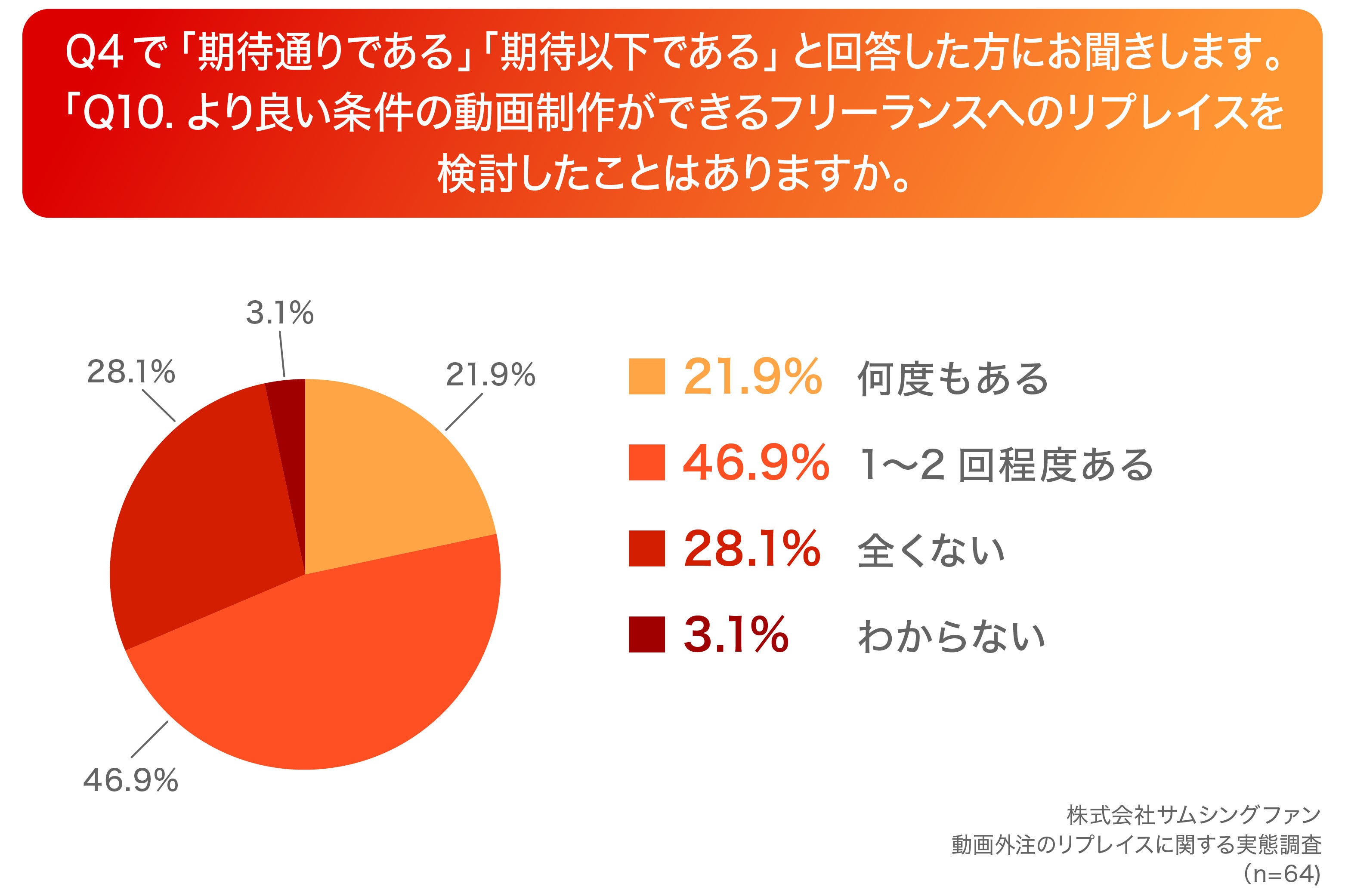 Q4で「期待通りである」「期待以下である」と回答した方に、「Q10.より良い条件の動画制作ができるフリーランスへのリプレイスを検討したことはありますか。」(n=64)と質問したところ、「何度もある」が21.9%、「1~2回程度ある」が46.9%という回答となりました。