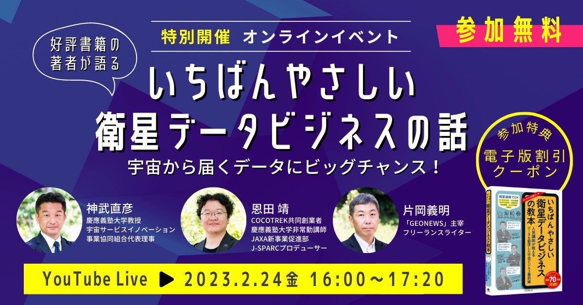 このような状況を受け、このたび当社では、好評書籍『いちばんやさしい衛星データビジネスの教本』の著者陣を講師に迎えたオンラインセミナーの特別開催を決定いたしました。本オンラインセミナーでは、衛星データの基礎知識や最新のビジネス活用事例の解説に加え、実際に衛星データの分析方法を紹介するパートも用意しているので、すでに衛星データの活用に取り組んでいる人の知識のアップデートだけでなく、まだ衛星データの知識のない方も知識から実践までひととおり理解できる内容になっています。さらに、参加者全員への参加特典として『いちばんやさしい衛星データビジネスの教本』の電子書籍版の割引クーポンも提供します(※当社直販サイト「インプレスブックス」で使用できるクーポン)。