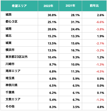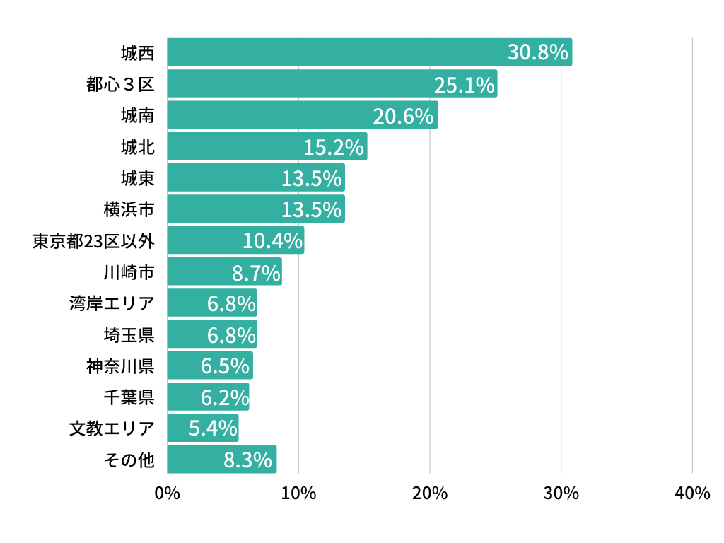- 「城西エリア」が2位の「都心3区」に5%の差をつけて希望エリアトップに