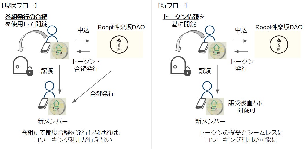 導入先はDAO(※2)型シェアハウス「Roopt(ループト)神楽坂DAO」(※3)。コワーキングルームのある母屋への入退室を「Roopt NFT Kagurazaka」の保有有無により管理します。シェアハウスのセキュリティとDAOメンバーの利便性を向上させるとともに、DAO運営の領域拡大と円滑化を目指していきます。(設置は2023年2月中旬予定)