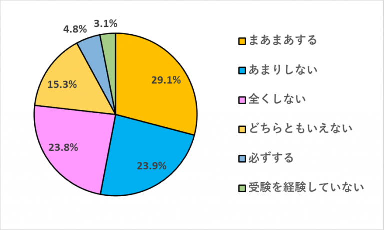 「受験を控えるにあたって、ジンクスやおまじない、験(げん)担ぎをしますか?」の質問については、「まあまあする」が29.1%、「あまりしない」が23.9%、「全くしない」が23.8%と、約半数の人がジンクスなどは気にしていないことが分かりました。
