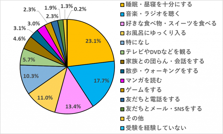 - 受験の際の気分転換やリフレッシュ方法は、「睡眠・昼寝を十分にする」が最多