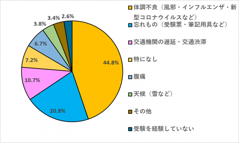 「受験当日に最も心配なことは何ですか?」の質問については、「体調不良(風邪・インフルエンザ・新型コロナウイルスなど)」が44.8%、次いで「忘れもの(受験票・筆記用具など)」が20.8%、「交通機関の遅延・交通渋滞」が10.7%という結果になりました。インフルエンザやコロナウイルスが流行していますので、受験を控える身であれば、大事な日にかかってしまわないかどうか心配になりますよね。