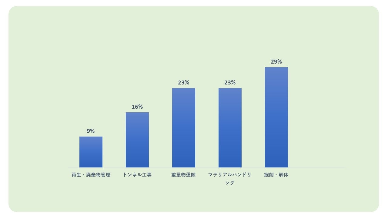 用途別では、掘削・解体、重量物運搬、トンネル工事、マテハン、再生・廃棄物管理などに分類されます。
