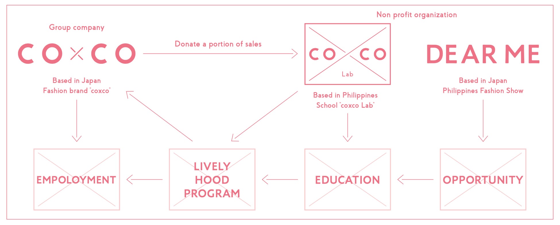 代表である西側は、2015年にファッションを通じた社会貢献活動を目指し弊団体を発足しました。主な活動として、フィリピン マニラの貧困地区で暮らす子どもたちが自己理解を深め、他者と共創する喜びを体験するファッションショーをこれまでに計8回開催して参りました。今後は、誰もが夢を描き夢中になれる公平な社会を目指しスクール「coxco Lab」を開校します。「coxco Lab」では、将来的に同スクールの卒業生を連携企業で雇用することで、NPOの社会貢献活動と事業を循環させ、教育と雇用創出により、持続的に貧困問題の解決を目指します。