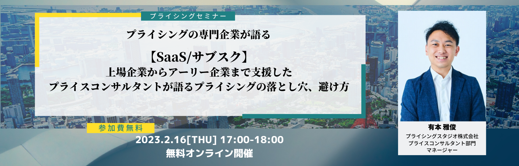 プライシングスタジオ株式会社(本社:東京都港区、代表取締役:高橋 嘉尋)は、無料オンラインセミナー【SaaS/サブスク】上場企業からアーリー企業まで支援したプライスコンサルタントが語るプライシングの落とし穴、避け方のセミナーを2月16日(木)17時に開催いたします。