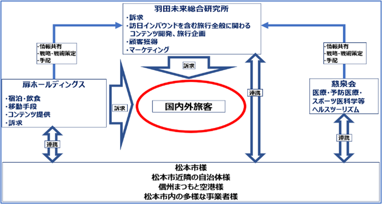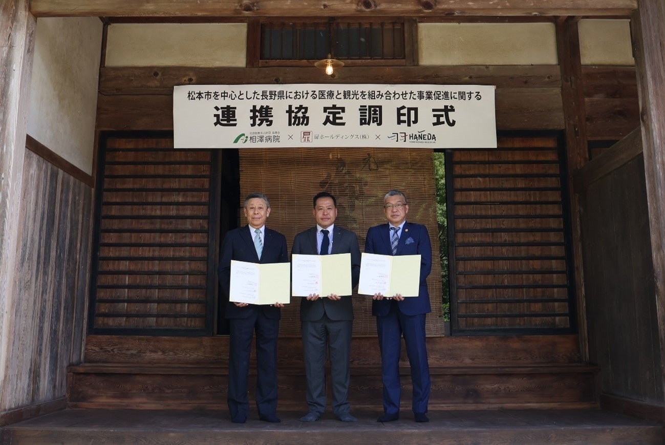 社会医療法人財団 慈泉会(長野県松本市、理事長 相澤 孝夫)と扉ホールディングス株式会社(長野県松本市、代表取締役社長 齊藤 忠政)、株式会社羽田未来総合研究所(東京都大田区、代表取締役社長執行役員 大西 洋)は、松本市を中心とした長野県における医療と観光を組み合わせた事業促進について、三者にて協力することを合意致しました。本合意は三者が相互に連携・協力して各々の知見を活かし、訪日医療・予防医療・スポーツ医科学等と、松本市を中心とした長野県の自然環境・水・食・歴史・文化等のコンテンツを再解釈して世界に発信することで、地域と世界を繋ぐ交流を生み出し、旅行を通じて地方創生及び世界の人々の健康に資することを目的としております。