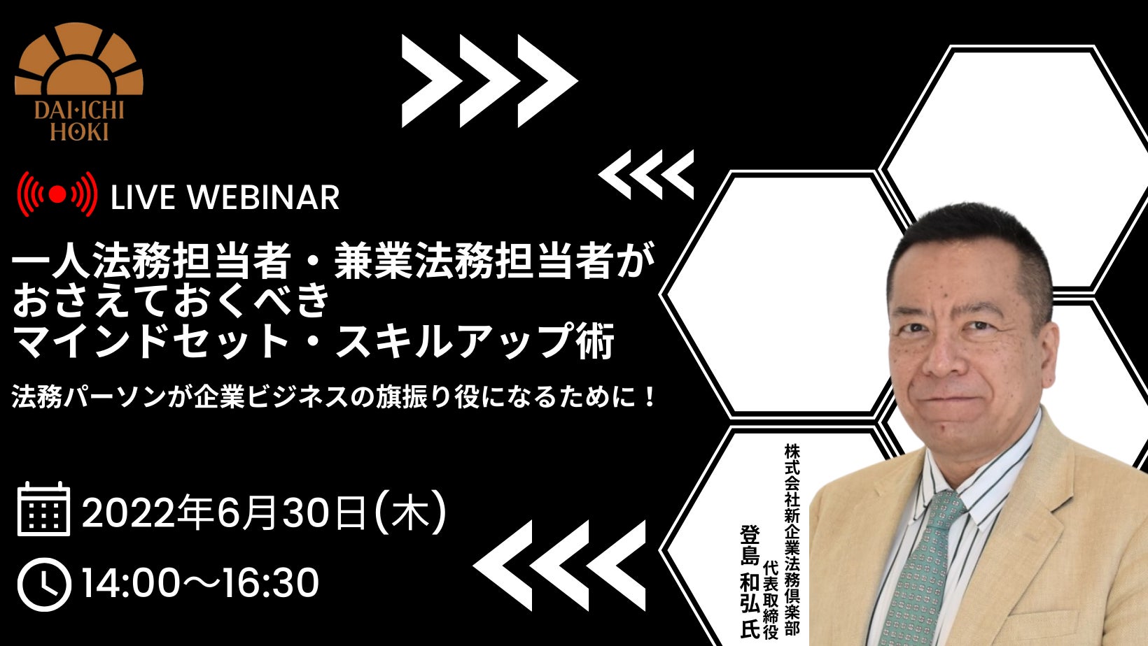 このような背景を踏まえ、今回は企業法務パーソンとして30年以上のキャリアがある実務家を講師に迎え、「一人法務担当者」「兼業法務担当者」の方がおさえておくべきマインドセット・スキルアップ術を解説した内容となっております。