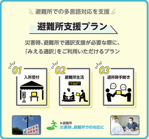 災害時、避難所の多言語対応を可能にする「みえる通訳」避難所支援プラン! 避難所でのご利用を想定した特別プランです。「みえる通訳」に加え、オフラインでも利用できる「たっち通訳」の併用で、受付から避難所生活中の支援、退所までをサポートします。