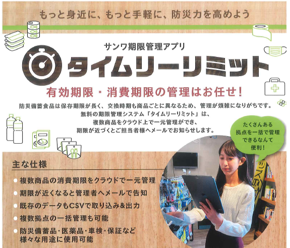 防災用品などの期限管理をクラウド上で一括管理します。WEBアプリなので、スマホやタブレットでも簡単に登録・閲覧が可能です。 商品のJANコードを読み取り商品検索ができたり、商品や保管場所の写真をアップロードできるので、どこに何が保存されているかも登録できます。 商品の期限が近付くと登録したメールアドレスに通知メールが届きます。