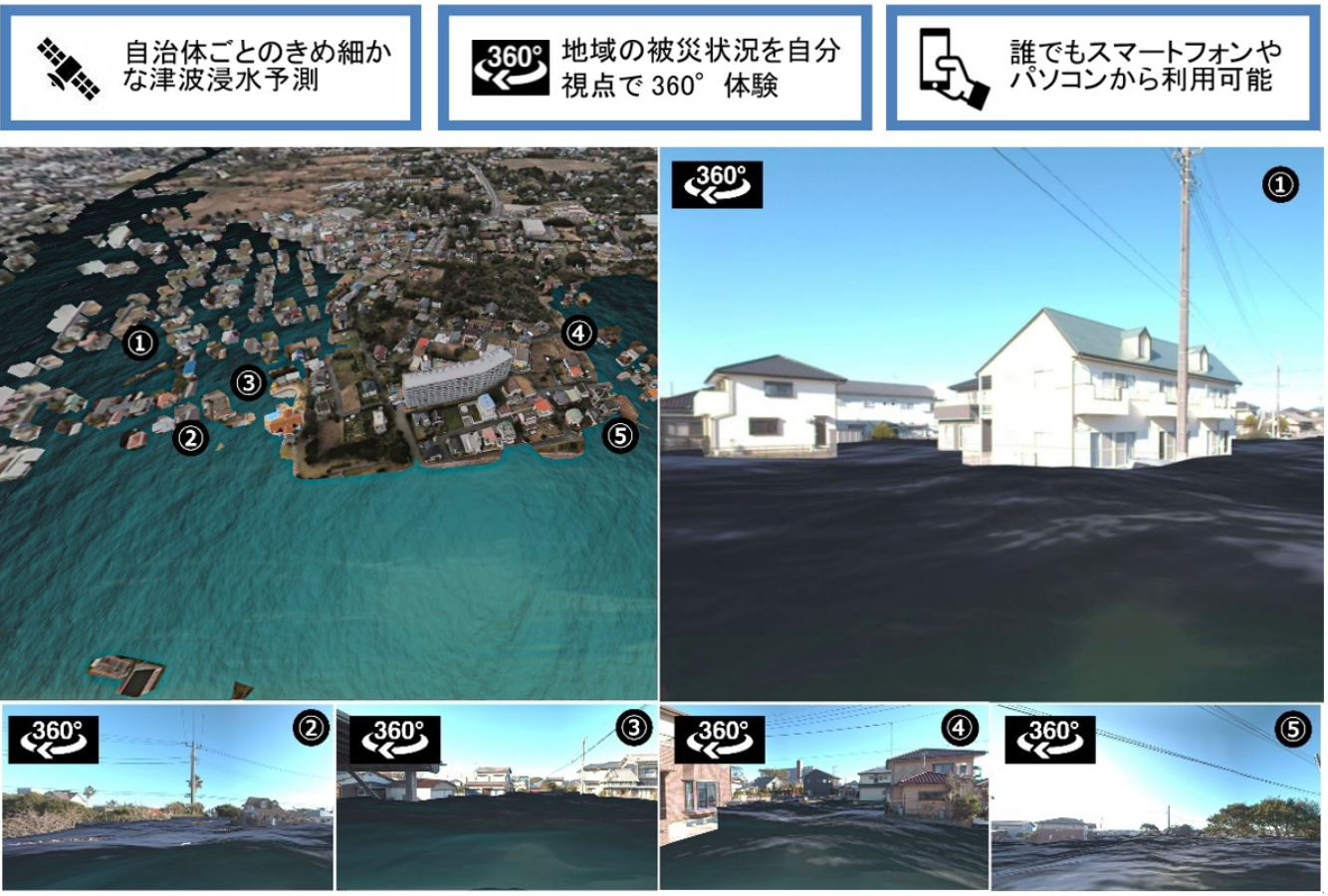 スマホやパソコンのブラウザを使って、誰にでもすぐ簡単に、オンライン津波避難訓練を行えるサービス。3Dデジタルマップとシミュレーション結果を全天周画像と組み合わせ、自治体ごとの浸水シミュレーションが可能。また、刻刻と変化する浸水状況を、対象地域のあらゆる地点から、自分視点で360°体験できます。