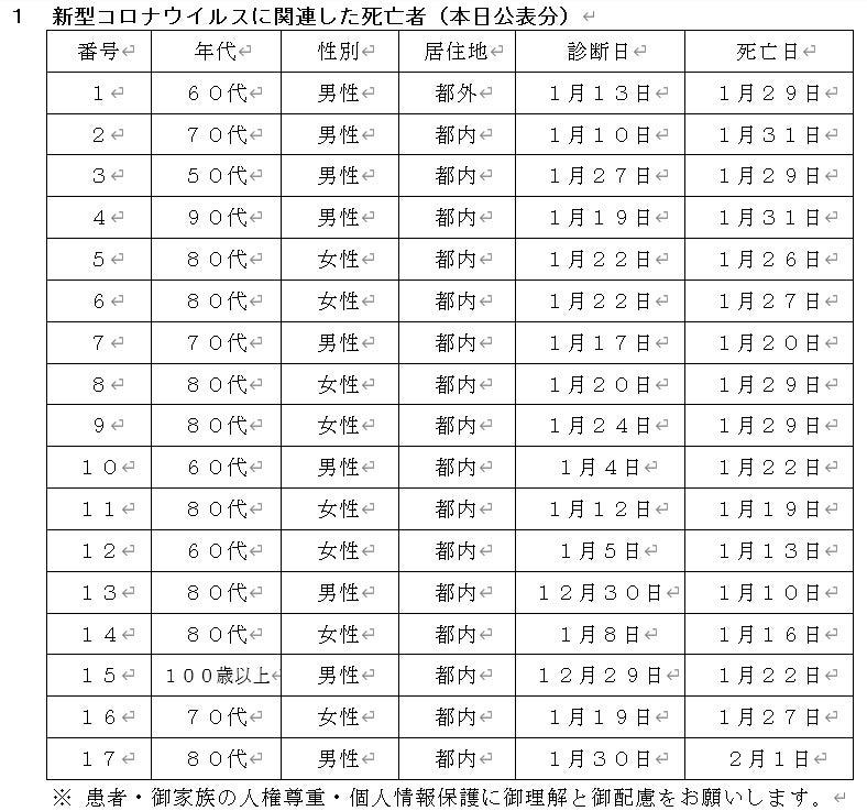 新型コロナウイルスに関連した患者の死亡について business Twitter Facebook はてブ Pocket LINE コピー 2023.02.03 この記事は約1分で読めます。 都内で新型コロナウイルスに感染した方が死亡されましたのでお知らせします。 お亡くなりになった方のご冥福をお祈り申し上げます。 2 新型コロナウイルスに関連した死亡者の累計 7,699人