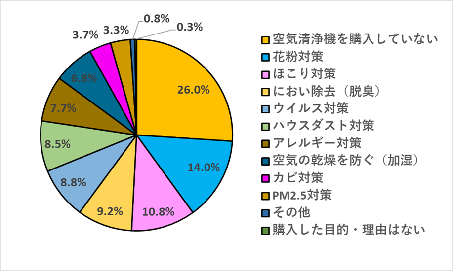 空気清浄機を購入した目的については、「空気清浄機を購入していない」と答えた26.0%の人を除くと、「花粉対策」が最多で14.0%となりました。次いで「ほこり対策」が10.8%、「におい除去(脱臭)」が9.2%という順になりました。