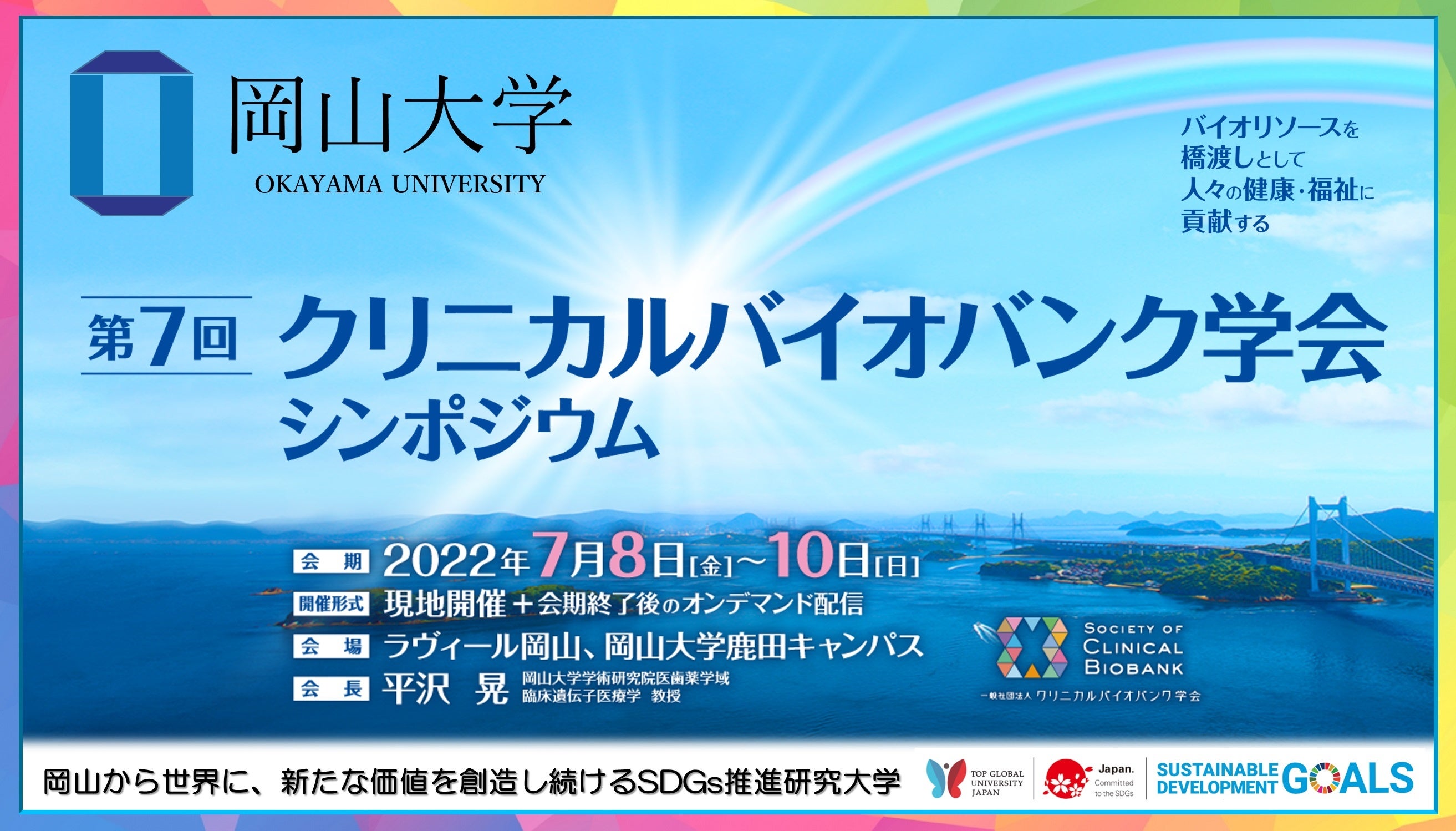 国立大学法人岡山大学(本部:岡山市北区、学長:槇野博史)は、学術研究院医歯薬学域(医)臨床遺伝子医療学分野の平沢晃教授を大会長として、「第7回クリニカルバイオバンク学会シンポジウム」を、2022年7月8日(金)~10日(日)に現地(ラヴィール岡山、岡山大学鹿田キャンパス)とオンラインの同時開催を行います。