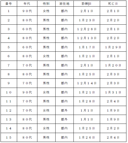 新型コロナウイルスに関連した患者の死亡について business Twitter Facebook はてブ Pocket LINE コピー 2023.02.05 この記事は約1分で読めます。 都内で新型コロナウイルスに感染した方が死亡されましたのでお知らせします。 お亡くなりになった方のご冥福をお祈り申し上げます。 1 新型コロナウイルスに関連した死亡者(本日公表分) 2 新型コロナウイルスに関連した死亡者の累計 7,732人