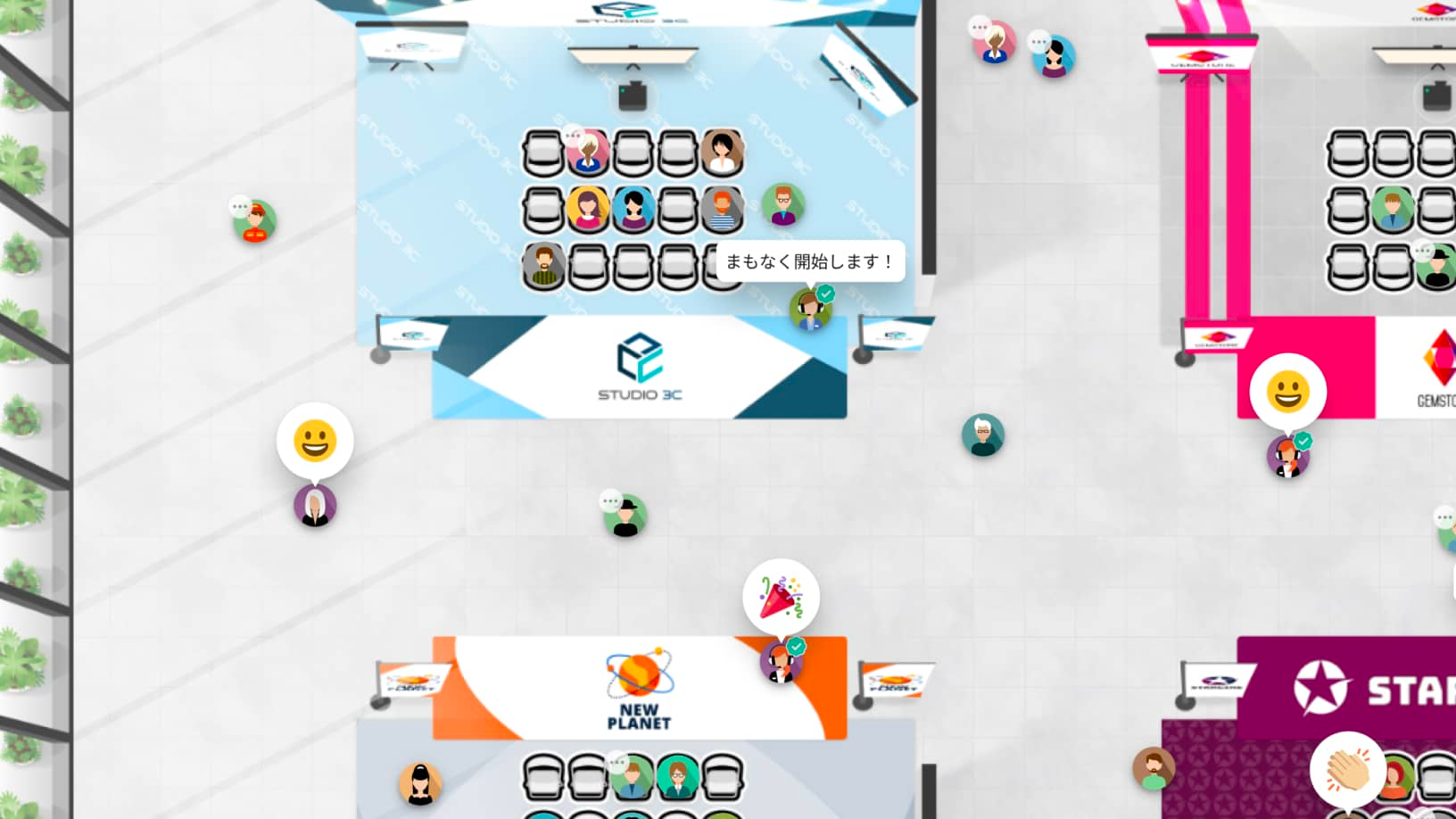 reBako.ioのオンライン会場には出展企業の各ブースが設置され、参加者は気になる企業を訪ねて担当者とビデオチャットでお話しができます。選択したアバターを操作してリアル会場と同様の臨場感でバーチャル空間の会場を自由に歩き回ることができます。