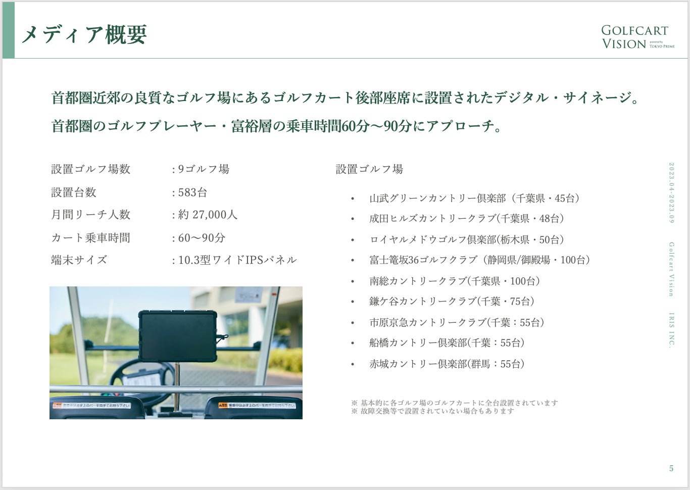 「Golfcart Vision」は2022年10月の販売開始当初、4ゴルフ場・合計243台のゴルフカートでスタートしており、販売開始以来、関東圏在住のゴルフプレイヤーに効率的に訴求できるメディアとして、広告主様からご好評の声をいただいております。