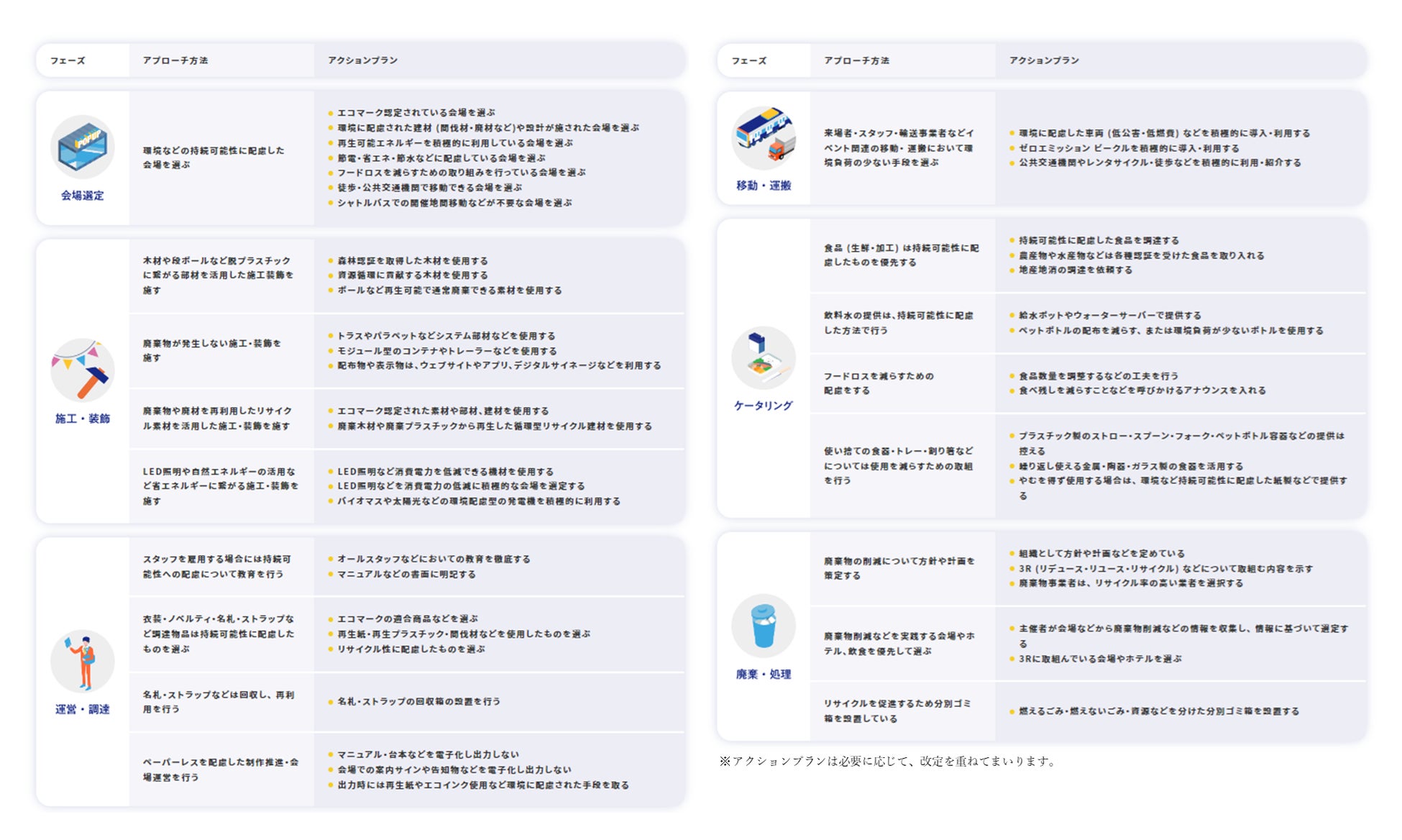 イベントの規模・内容・目的に応じて、環境配慮すべき重点項目も変化すると考えております。イベントを主催する企業・自治体・団体が求める環境配慮要請とのバランスを鑑みながら、最適なアクションプランを協議して見定めていくことを前提に考えられたガイドラインになっております。