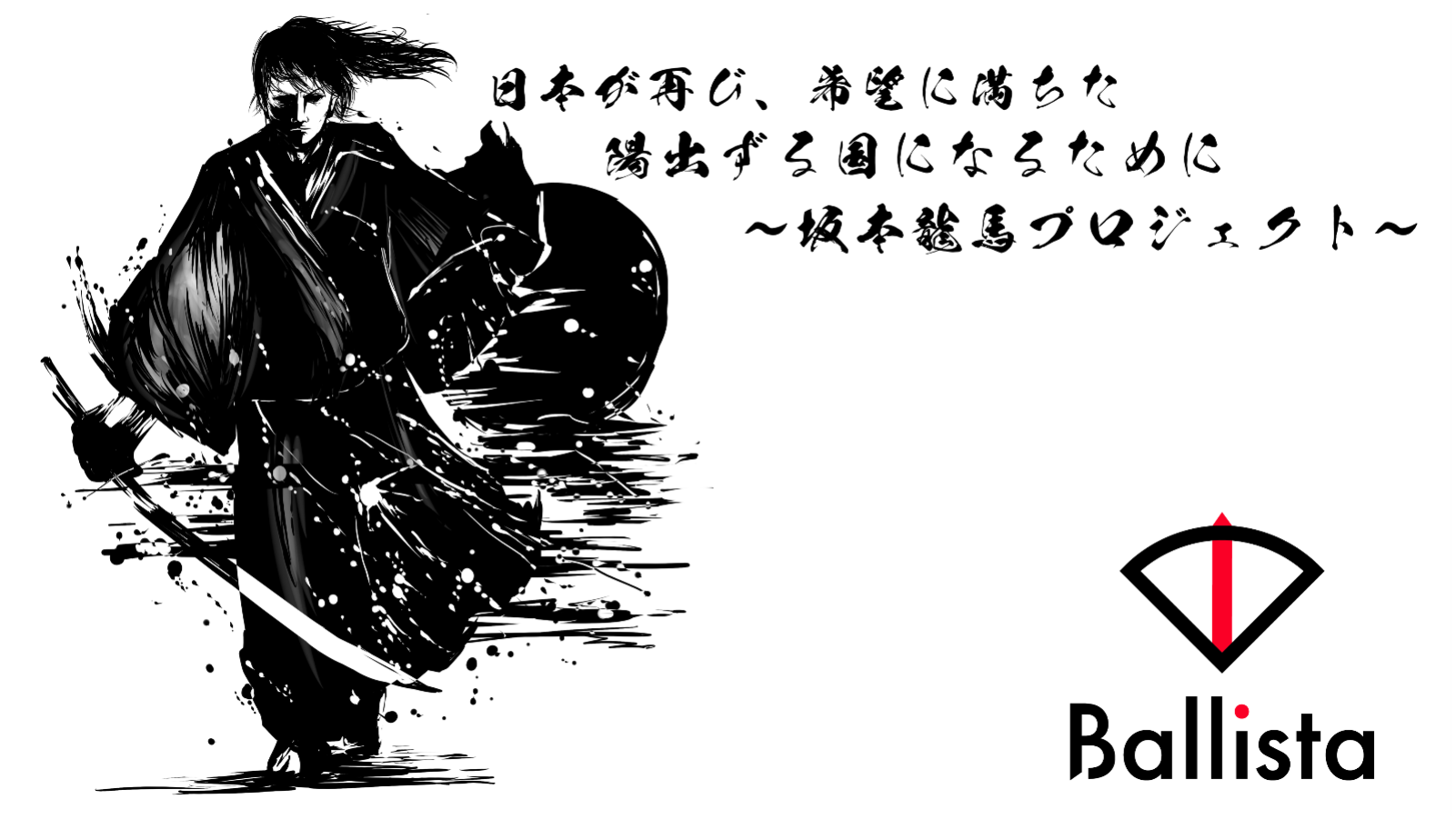 日本の新しい時代を作った坂本龍馬は、「世界に出たい」という自分の夢に向かって動いた人物であり、多くの人が実現不可能だと思っていることでも成功させられる行動力や突破力、新しい時代の明確なビジョンを持ち、そして、優れた人脈を幅広く持っていました。Ballistaは、そんな坂本龍馬のような仲間とともに“プロフェショナルギルドの実現”し、“日本が再び、希望に満ちた陽出ずる国になる“ために、「坂本龍馬プロジェクト」を発足させました。