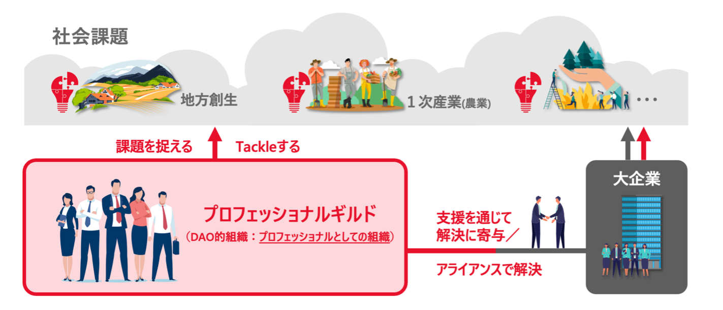 プロフェッショナルギルドは、社会課題に立ち向かい、新たな価値を創造するために各方面のプロフェッショナルが集結した組織です。大きな社会課題に対して直接的にアプローチすることに加えて、大企業のDX推進や新規事業創出、組織変革の支援及びアライアンスを通じた間接的なアプローチでの解決を狙います。