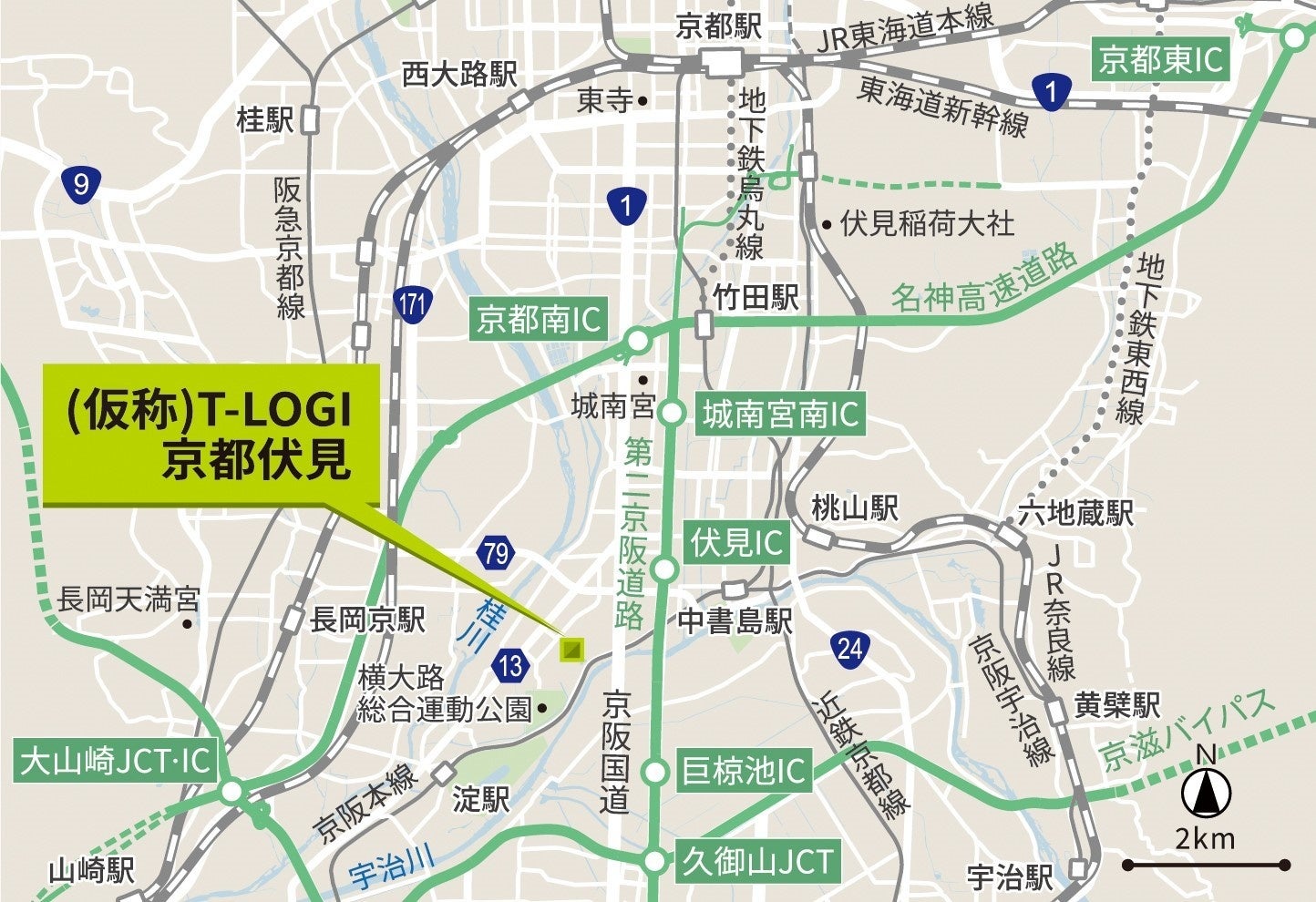 本物件は、第二京阪道路「伏見」IC まで約1.5km、国道1 号利用で京都駅まで約8.5km の距離に位置し、京都市中心部への配送拠点として優れた立地となっています。加えて、第二京阪道路「巨椋池」ICまで約4.9km、名神高速道路「京都南」IC まで約3.7km と、大阪中心部をはじめとする関西一円を輸配送エリアとすることが可能です。